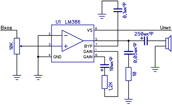 Рисунок 2. УНЧ на микросхеме LM386 с коэффициентом усиления 20